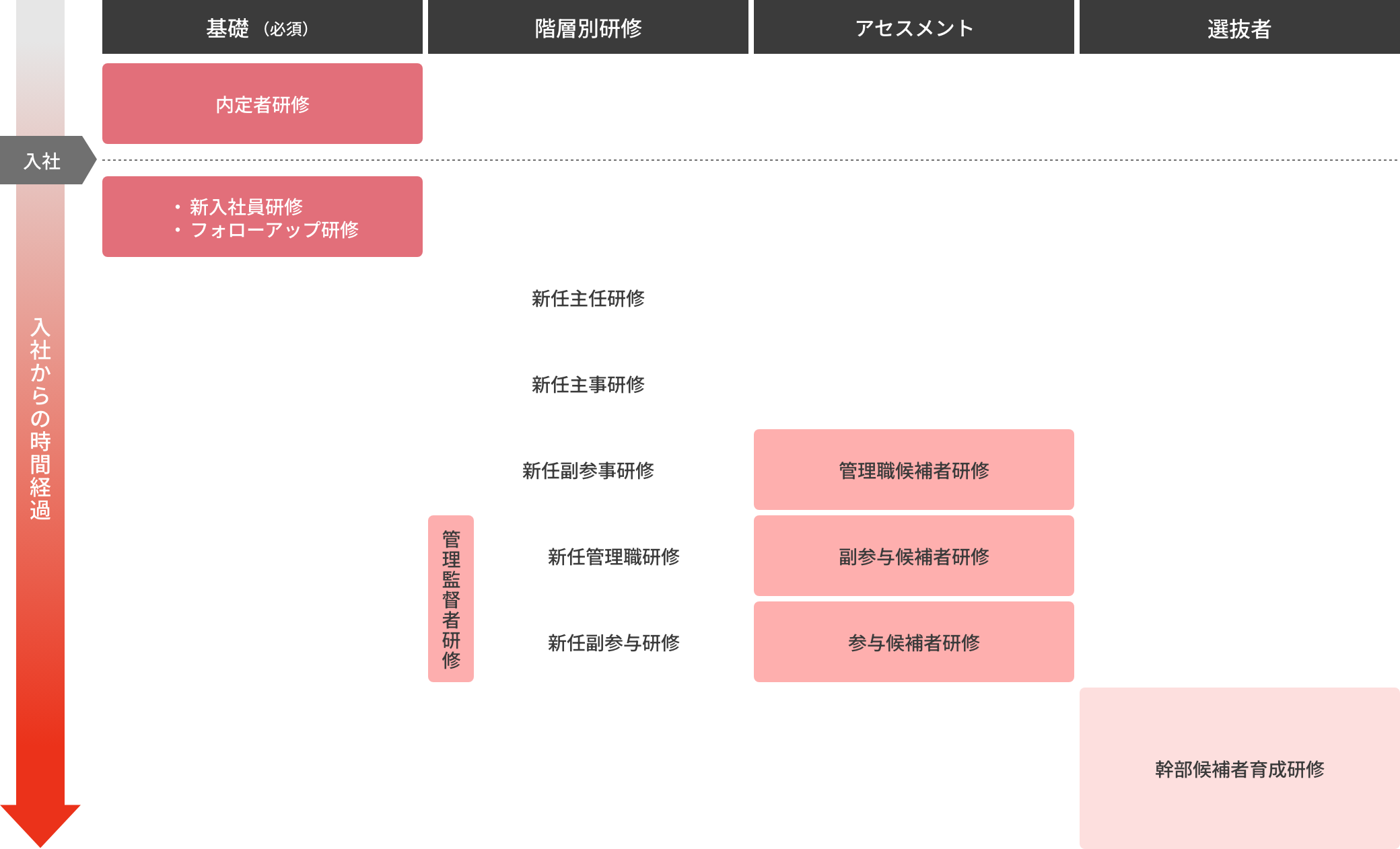 年次や役割に応じた段階的な研修制度を用意しています。内定者・新入社員から若手としての基礎を固める研修にはじまり、ステップアップの各段階で階層別研修やアセスメント研修、幹部候補者育成研修などを実施。将来を見据えたキャリア形成を継続的に支援します。